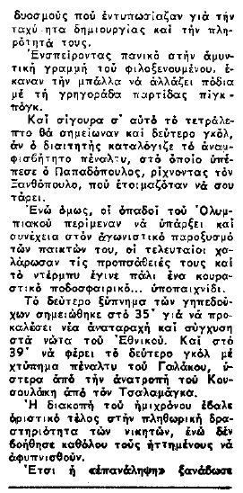 Τα σημεία που πρέπει να σταθούμε σε αυτό το ματς, είναι το καθαρό μπέναλντυ που δεν μας έδωσε ο Βούλγαρης, αλλά και οι σύντομες δηλώσεις του Τόζα. Όσον αφορά το πρώτο, είχε μόλις αρχίσει να πιάνει τις άκρες του ο ''καπετάνιος'' κι έστελνε τα κοράκια του να κυνηγάνε τον Θρύλο. Το τι ακριβώς έγινε εκείνη την χρονιά και από πόσα κύματα περάσαμε για να σηκώσουμε την κούπα, μετά από 4 χρόνια, είναι γνωστό στους παλαιότερους, αλλά κι εμείς εδώ θα τα ξαναδούμε εν καιρώ. Γιατί ΚΑΙ τότε κερδάγαμε και τους διαιτητάς, πέραν των αντιπάλων μας στα γήπεδα, όπως γίνεται μια ζωή εξ άλλου. Μόνο που τότε, ο Βαρδινογιαννισμός πολλές φορές ήταν ισχυρότερος αντίπαλος από κάθε άλλον για την ομάδα μας. Όσον αφορά το δεύτερο, ο γίγαντας ο Τόζα βιαζότανε να πάει δίπλα στο Δέλτα να στήσει κάνα συνθετάκι. Μπαμ μπουμ, ξεμπέρδεψε με τα τυπικά και αφοσιώθηκε στο χόμπι του.