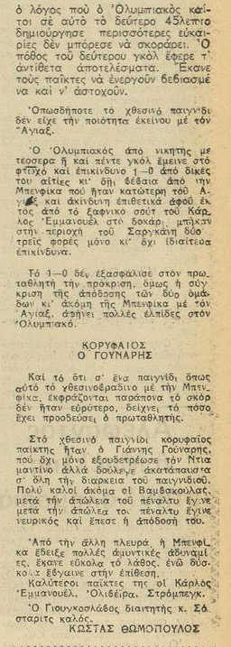 19/10/1974 ΟΛΥΜΠΙΑΚΟΣ - ΟΛΥΜΠΙΑΚΟΣ ΒΟΛΟΥ 3η Αγωνιστική Πρωτάθλημα Α' Εθνικής 4-1 20' ΣΤΑΥΡΟΠΟΥΛΟΣ, 24' ΤΡΙΧΙΑΣ, 59' - 64' ΚΡΗΤΙΚΟΠΟΥΛΟΣ, 67' ΔΑΒΟΥΡΛΗΣ