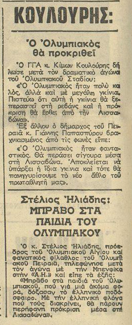 19/10/1947 ΟΛΥΜΠΙΑΚΟΣ – ΠΑΝΕΛΕΥΣΙΝΙΑΚΟΣ 4η Αγωνιστική Πρωτάθλημα Πειραιώς 6 – 2 3' - 9' ΔΑΡΙΒΑΣ, 10' Καλαρίδης, 20' Κάτρης (Αυτ.), 35' - 57' - 63' ΒΑΖΟΣ, 86' Τζινίδης