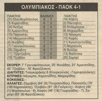 08/11/1999 ΟΛΥΜΠΙΑΚΟΣ – ΠΑΟΚ 6η Αγωνιστική Πρωτάθλημα Α' Εθνικής 4-1 7' ΓΙΑΝΝΑΚΟΠΟΥΛΟΣ, 25' ΝΙΝΙΑΔΗΣ, 31' ΑΜΑΝΑΤΙΔΗΣ, 45' ΤΖΙΟΒΑΝΙ, 77' Φραντζέσκος