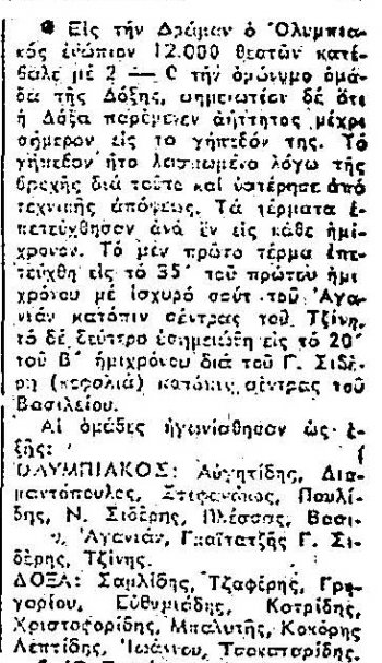08/11/1964 ΔΟΞΑ ΔΡΑΜΑΣ – ΟΛΥΜΠΙΑΚΟΣ 7η Αγωνιστική Πρωτάθλημα Α' Εθνικής 0-2 35' ΑΓΑΝΙΑΝ, 65' ΣΙΔΕΡΗΣ