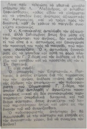 Το ΦΩΣ είναι αρκετά πιο φειδωλό σε λεπτομέρειες από την ΗΧΩ, που δημοσιεύει και φωτογραφία του περιστατικού, όπως βλέπουμε, κρατώντας αποστάσεις από αυτήν την ΑΠΕΡΙΓΡΑΠΤΗ, πραγματικά, ενέργεια. Ο ΠΑΟ κερδίζει 1-0, το ματς πλησιάζει προς τη λήξη του και ξαφνικά μπουκάρει στον αγωνιστικό χώρο ένας μπάτσος, διακόπτει τον αγώνα και μεταφέρει το Σιδέρη κάτω από τα επίσημα της Λεωφόρου, ώστε να του μιλήσει ο Παττακός. Τι του είπε? ''Παίξε πιο ήρεμα''. Χρειάζεται να προσθέσει κανείς κάτι άλλο εδώ πέρα? Το χουντοειδές απολίθωμα νόμιζε ότι οι παίκτες είναι στρατιωτάκια του και θα κάθονταν προσοχή. Ας δούμε πώς περιέγραψε το σκηνικό ο Πάνος Γεραμάνης, που ήταν παρών στις εξέδρες του γηπέδου, πολλά χρόνια αργότερα, με την απάντηση του Σιδέρη.