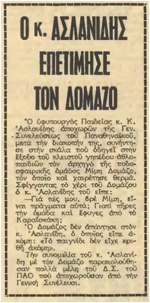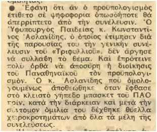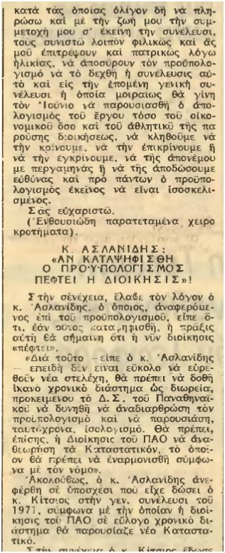 Ο ''υφυπουργός Παιδείας και μέλος του ΠΑΟ'', λοιπόν, Κώστας Ασλανίδης, έγινε δεκτός με θύελλα χειροκροτημάτων από τα μέλη του Συλλόγου όταν ανέβηκε στο βήμα να μιλήσει. Βοήθησε στο να αποσυρθεί ο προυπολογισμός που είχε φέρει προς έγκριση ο μέχρι τότε πρόεδρος του ΠΑΟ Κίτσιος, αφού δεν ήταν ισοσκελισμένος. Μάλωσε το Δομάζο, αυτόν που αποκαλούσε ''παιδί του'', για το ότι πήρε την ομάδα και έφυγε από το γήπεδο στο ντέρμπυ του πρωταθλήματος στο Καραισκάκη (άσχετα που οι παραμυθάδες βάζελοι μας λένε πως ''ουδέποτε αποχώρησε ο ΠΑΟ'' σήμερα, 40 χρόνια μετά, προσπαθώντας να ξαναγράψουν την ιστορία). Εξήγησε πως τον Κίτσιο τον είχε ψηφίσει κι αυτός στις εκλογές του Σεπτεμβρίου 1971, όπου κινδύνευσε να πεθάνει κιόλας λίγο μετά, αφού αντιμετώπισε ένα πρόβλημα υγείας και διακομίστηκε στο νοσοκομείο. Σε εκείνη τη ΓΣ των μελών του ΠΑΟ, είχε ομολογήσει δημόσια ο Ασλανίδης πως ήταν Παναθηναικός, αφού είχε επιχειρήσει να εγγραφεί μέλος του Συλλόγου το 1952 και η αίτησή του είχε απορριφθεί, όπως έχουμε δει. Τότε μάλιστα, το 1971, έγινε οριστικά μέλος του ΠΑΟ ''δια βοής'', με τους οπαδούς του Ολυμπιακού να θέλουν να ''καταπιούν'' το βάζελο Ασλάνα..
