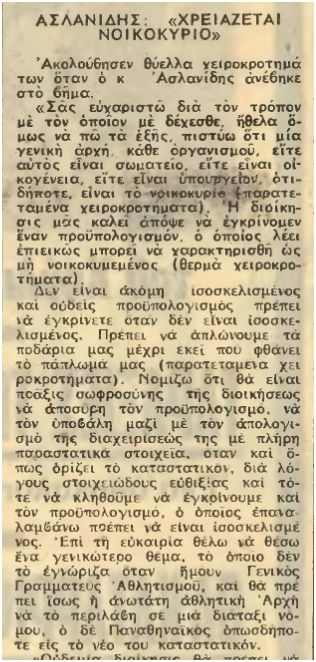 3 Μαίου 1973, 40 χρόνια πριν από σήμερα. Στην Ελλάδα γενικά και επομένως και στον αθλητισμό έχουμε Χούντα. Στον ΠΑΟ έχουν προκηρυχθεί εκλογές. Την προεδρία διεκδικούν ένας νεαρός, τότε, επιχειρηματίας, ο Παύλος Γιαννακόπουλος, έχοντας την υποστήριξη της πτέρυγας Απόστολου Νικολαίδη-Πανουργιά-Μαντζεβελάκη, αλλά και ο πρώην κυβερνητικός επίτροπος του ΠΑΟ και αντιδήμαρχος Αθηναίων επί χούντας Σπύρος Ανέστης. Ο ΠΑΟ έχει χάσει το πρωτάθλημα του 1973 και οι εκλογές αυτές είναι πολύ κρίσιμες, αφού κυριαρχεί το ερώτημα ''πού θα βρεθούν λεφτά για να κοντράρουμε το Γουλανδρή?''. Αυτός είναι και ο λόγος που αρκετά μέλη του Συλλόγου τάσσονται στο πλευρό του Γιαννακόπουλου, ελπίζοντας πως θα είναι σε θέση να τα βάλει με τον εφοπλιστή που αγόραζε τον έναν παίκτη πίσω από τον άλλον για τον Θρύλο. Σε αυτές τις εκλογές, καταλυτική θα είναι η παρέμβαση του Ασλανίδη. Ο Ασλανίδης εκείνη την περίοδο δεν ήταν ΓΓΑ, αλλά υφυπουργός Παιδείας. Έτσι, δεν είχε κανένα πρόβλημα να παρευρεθεί σε μία Γενική Συνέλευση των μελών της αγαπημένης του ομάδας και να ψηφίσει κιόλας, για το καλό της. Δεν τον ένοιαζε ιδιαίτερα το να ''χρωματιστεί'' οπαδικά στα μάτια του κόσμου, αφού όλοι ήξεραν πως ήταν Παναθηναικός και δεν είχε πλέον κάποιο αξίωμα σχετικό με τον αθλητισμό στην ''Κυβέρνηση''.