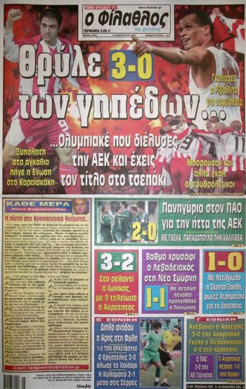 Μεγάλη νίκη του Θρύλου του Σόλιντ επί της ΑΕΚ του Σάντος, με πρωταγωνιστή τον ηγέτη του Θρύλου εκείνη την περίοδο Ριβάλντο, που καθάριζε όλα τα κρίσιμα ματς. Με τη νίκη αυτήν ξεφύγαμε 9 βαθμούς από την ΑΕΚ και ουσιαστικά καθαρίσαμε το δεύτερο σερί πρωτάθλημα στο Νέο Καραϊσκάκη και το 9ο σε 10 χρόνια, με το διάλειμμα Δούρου στο ενδιάμεσο. Ο τότε αρχηγός της ΑΕΚ Κατσουράνης είχε βγει και είχε δηλώσει πριν το ματς ''πάμε για νίκη εκεί μέσα'' και μετά ζήτησε συυγνώμη, ως αεκάκι που είναι. 4 νίκες σε 4 ντέρμπι με ΠΑΟ-ΑΕΚ ο Θρύλος εκείνη την χρονιά.