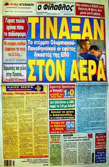 Υ.Γ. 2 Οι αναγνώστες του site και γενικότερα όσοι έχουν ασχοληθεί με την ιστορία του Ολυμπιακού, ξέρουν και μία άλλη ιστορία με απόφαση λίγες μέρες πριν από ντέρμπι ΠΑΟ-Ολυμπιακού, το 1980, με την ''ξαφνική'' τιμωρία Γαλάκου-Νικολούδη του Θρύλου με επέμβαση των Βαρδινογιάννηδων ώστε να μην αγωνιστούν στο δημοτικό γήπεδο της Λεωφόρου Αλεξάνδρας. Αυτά φυσικά είναι ''ψιλά γράμματα'' για τους ''αμερόληπτους'', εδώ δεν θυμούνται τα του Ζε Ελίας το 2001, θα θυμηθούν (οι παλαιότεροι εξ αυτών) ή θα γνωρίζουν (οι νεότεροι τραχανοπλαγιάδες ''αντικειμενικοί δημοσιογράφοι'') μία υπόθεση του 1980;